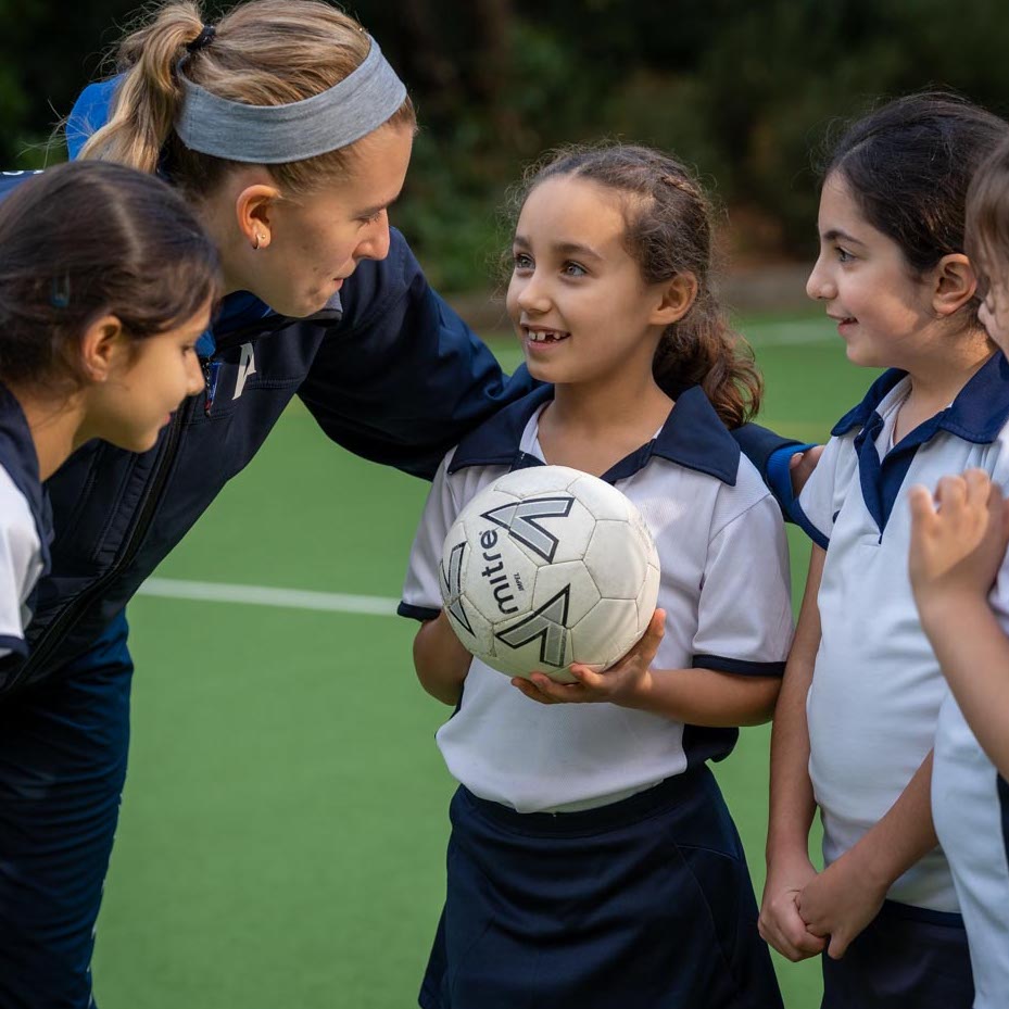 Little girls in blue and white sports kit standing with a netball talking to their teacher