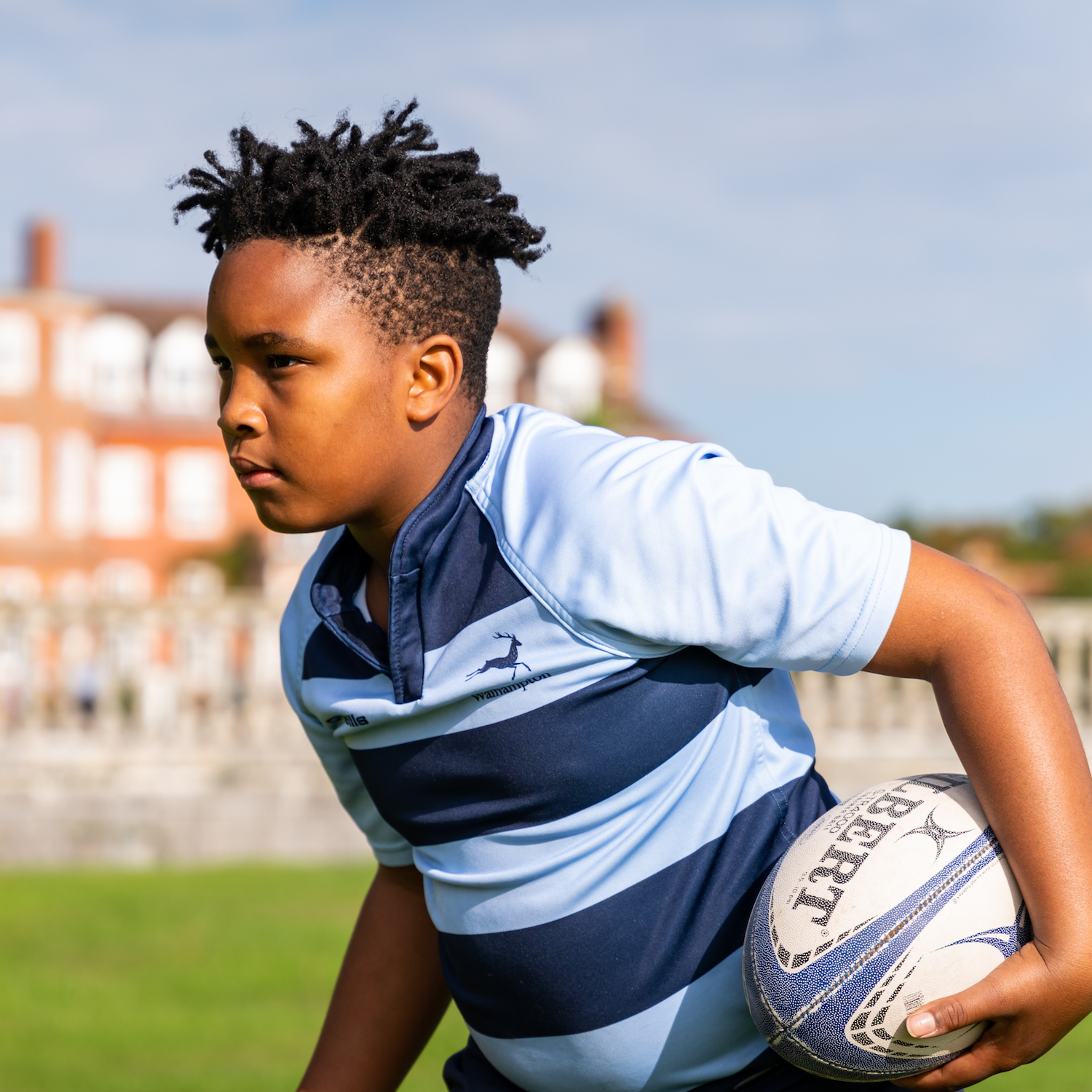 Boy in blue striped top running with a rugby ball