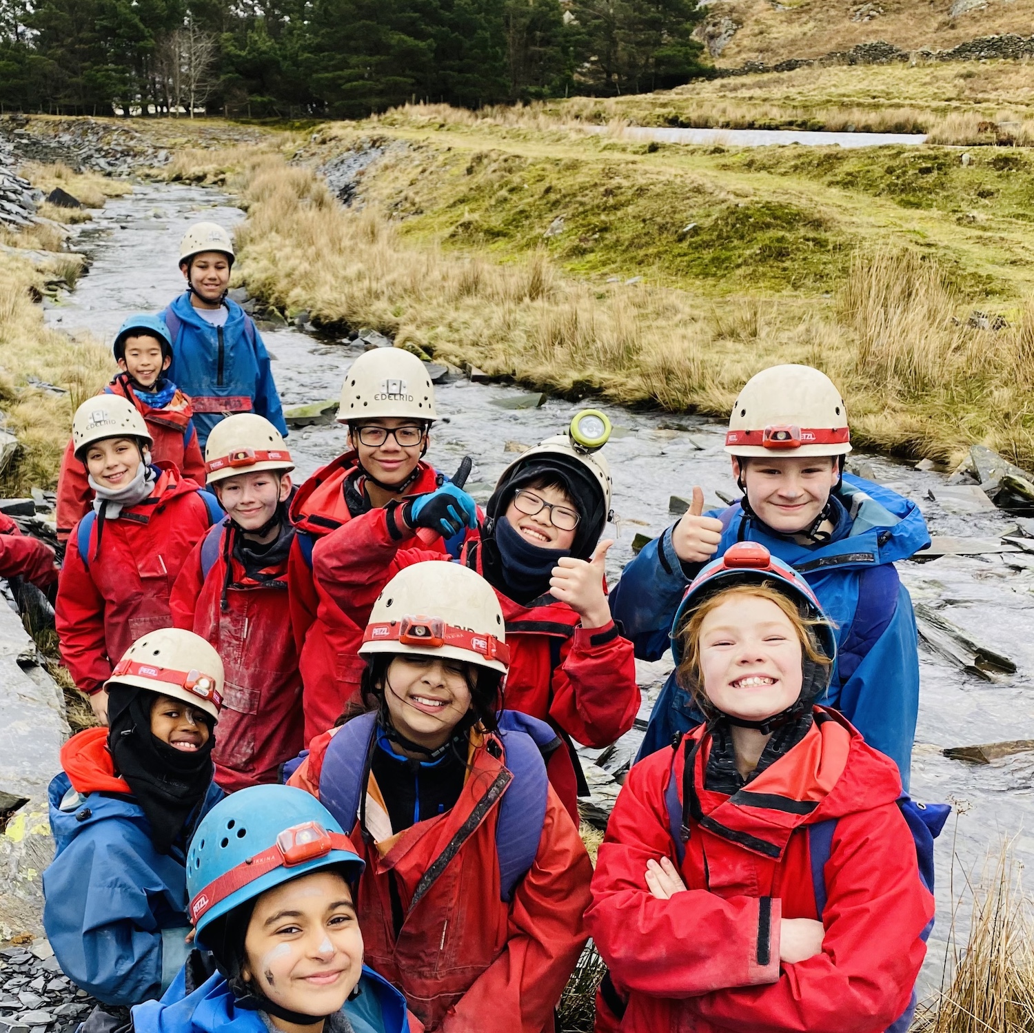 Boys and girls by a river wearing red and blue jackets and blue and white helmets