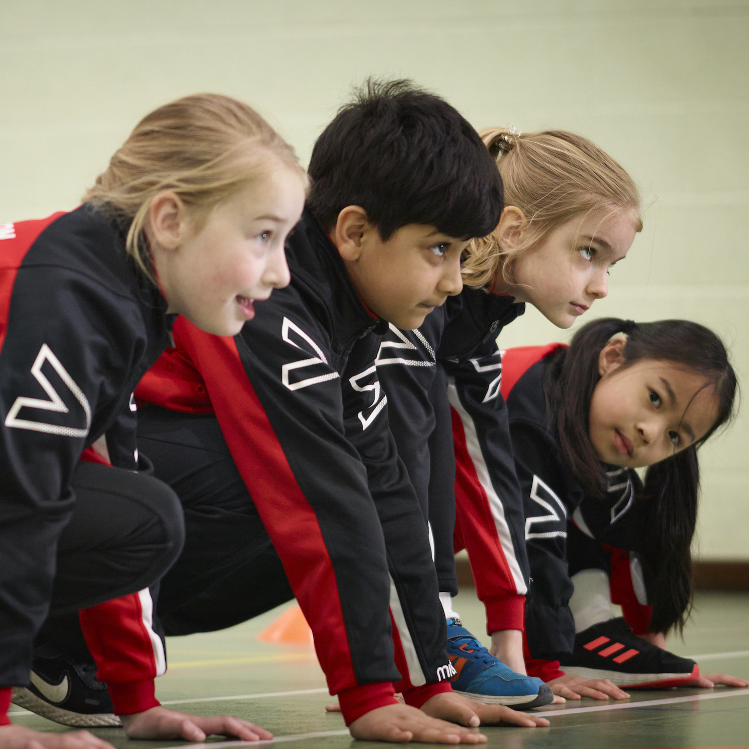 pupils in black and red tracksuits crouched on a green floor