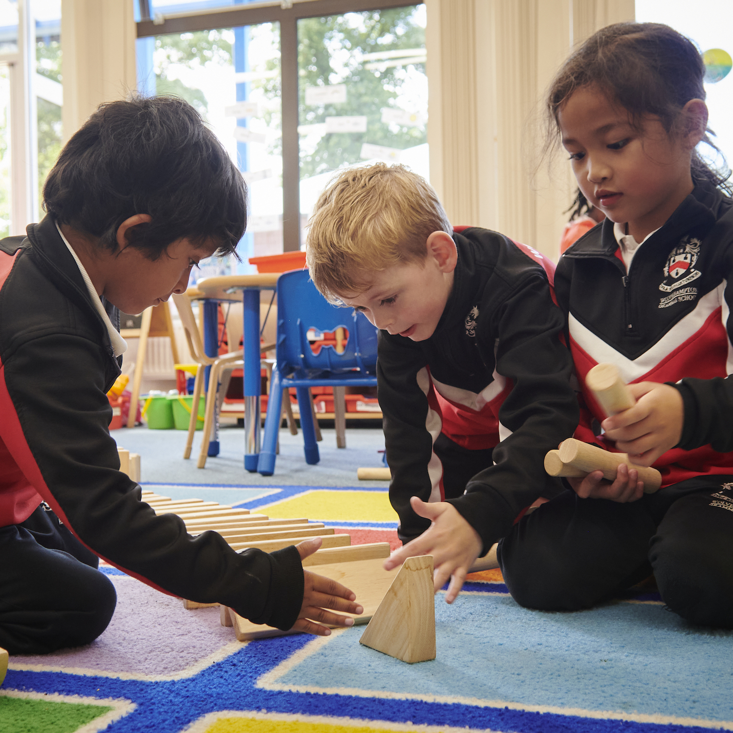 Children playing with wooden blocks on a colourful carpet