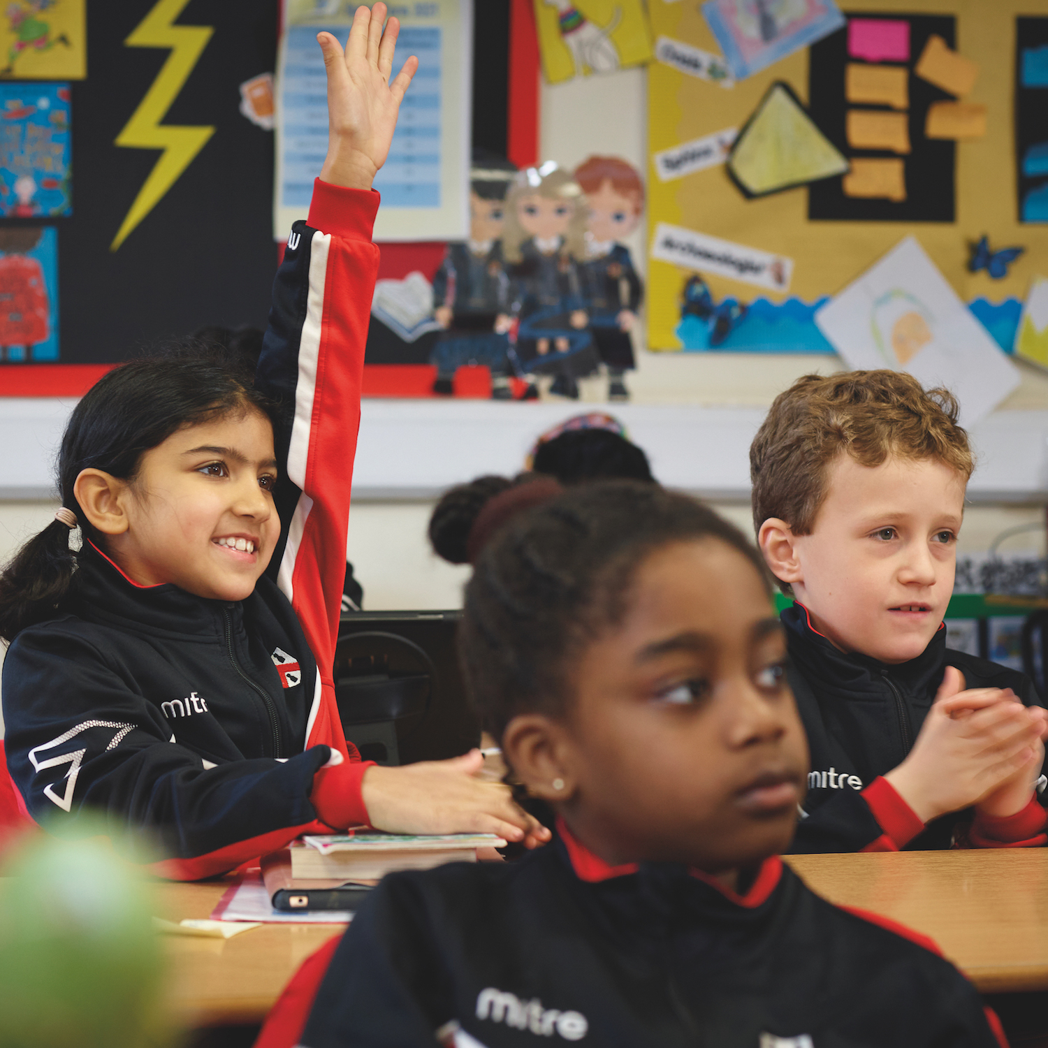 Pupils in class and girl with her hand up