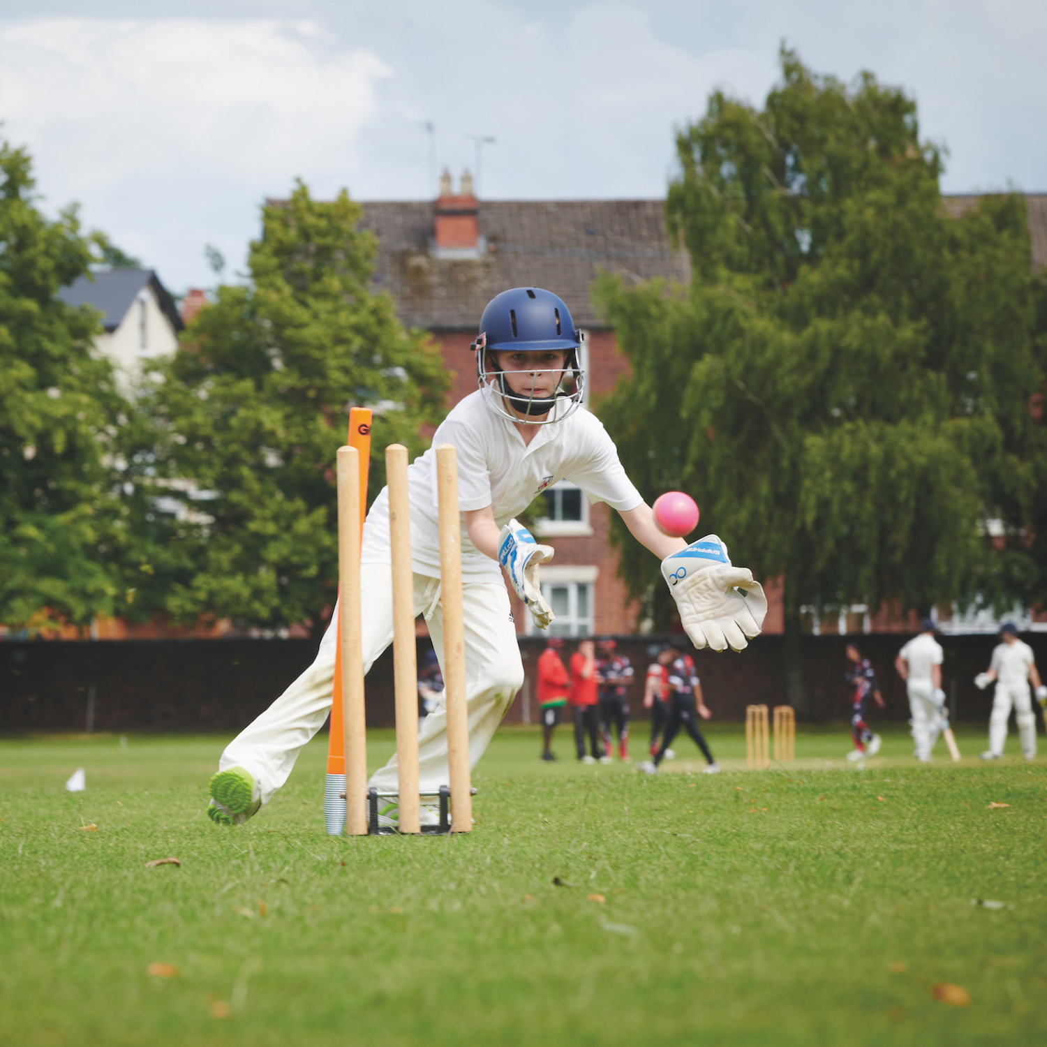 Boy in cricket whites and a blue helmet catching a pink ball