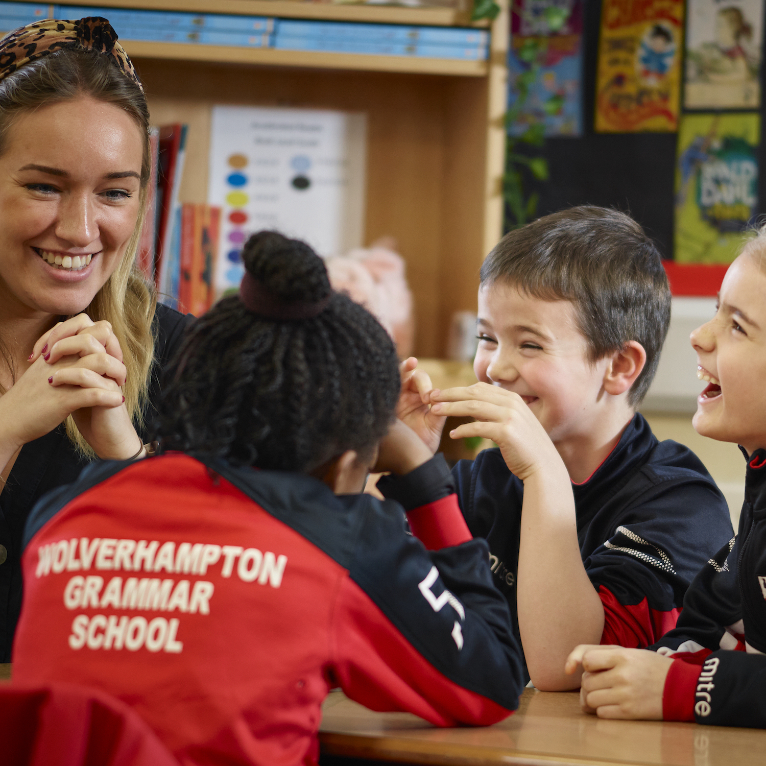 Pupils sitting at a wooden table laughing with a teacher